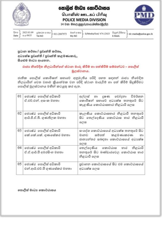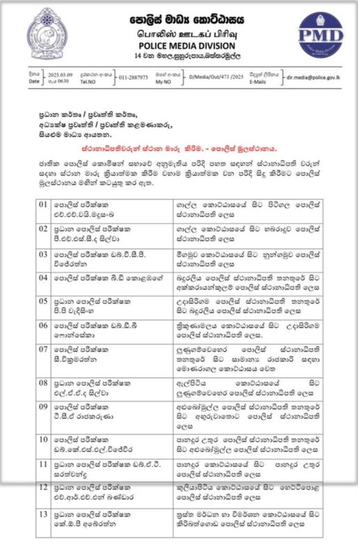 ජාතික පොලිස් කොමිසමේ අනුමැතිය මත වහාම ක්රියාත්මක වන පරිදි පොලිස් නිලධාරීන් 37 දෙනෙකු (37) ස්ථාන මාරු කර තිබේ.