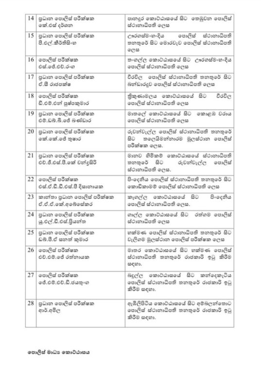 ස්ථාන මාරුවීම් ලැබූ නිලධාරීන් අතර ස්ථානාධිපතිවරුන් 28 දෙනෙකු සහ ජ්යෙෂ්ඨ පොලිස් අධිකාරීවරුන් (එස්එස්පී) පස් දෙනෙකු ඇතුළත් වේ.