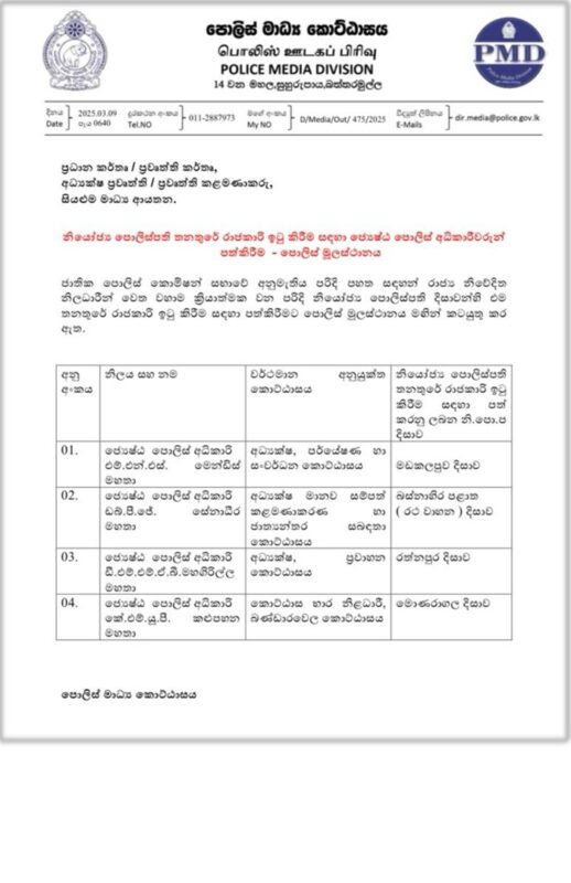 ජ්යෙෂ්ඨ පොලිස් අධිකාරීවරුන් හතර දෙනෙකු ස්ථාන මාරු කර නියෝජ්ය පොලිස්පතිවරුන් (ඩීඅයිජී) ලෙස පත් කර තිබේ.
