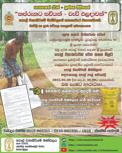 විලි සහ ප්රජා යටිතල පහසුකම් අමාත්යාංශයේ පොල් වගා කිරිමේ මණ්ඩලය විසින් ක්රියාත්මක කරනු ලබන “කප්රුකට සවියක් – වැඩි ඵලදාවක්” යටතේ පොල් වගාකරුවන් වෙත සහන මිලට පොහොර ලබාදීමේ වැඩසටහනඅද (30) ආරම්භ වේ.