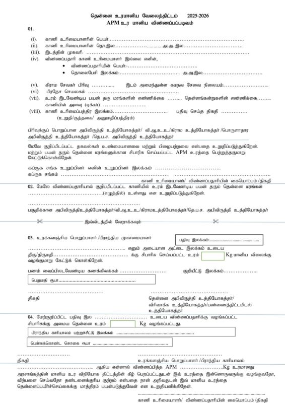 இந்த சலுகை மானிய கொடுப்பனவை பெற, தென்னை விவசாயிகள் தென்னை பயிர்ச்செய்கை சபையினால் தயாரிக்கப்பட்ட விண்ணப்பப் படிவத்தை நிரப்பி, தொடர்புடைய அங்கீகரிக்கப்பட்ட நிறுவனங்களுக்குச் சமர்ப்பிக்க வேண்டும். விண்ணப்பப் படிவத்தை தென்னை பயிர்ச்செய்கை சபையின் அதிகாரப்பூர்வ இணையதளத்தில் இருந்து பெறலாம். (இணையதளம் https://coconutsrilanka.lk/)
