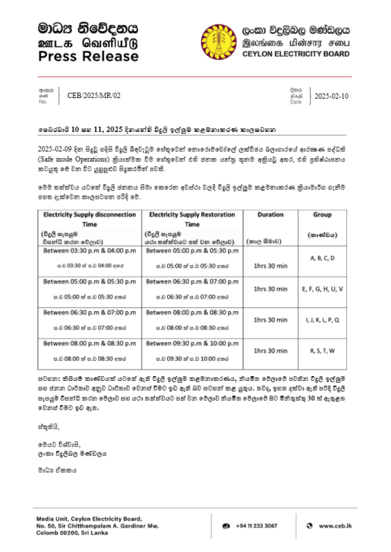 ඒ අනුව එම විදුලි කප්පාදුව සිදුකරනු ලබන කාල සටහන එම මණ්ඩලය විසින් මේ වන විට ප්රකාශයට පත් කර ඇත.