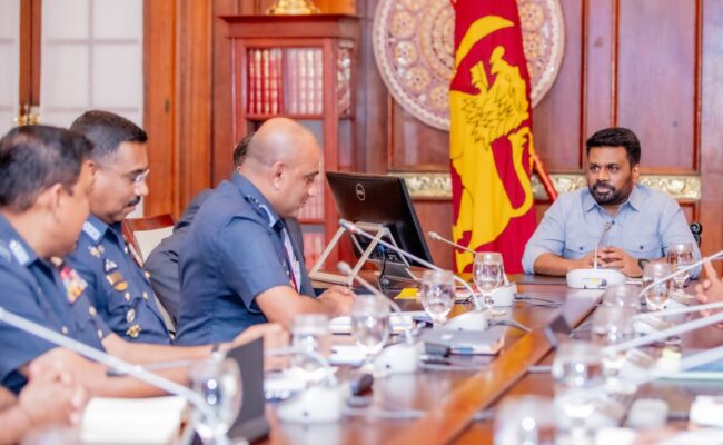 අද (27) ජනාධිපති කාර්යාලයේදී මෙරට වත්මන් ආරක්ෂක තත්ත්වය පිළිබඳ සාකච්ඡාවක් ජනාධිපති අනුර කුමාර දිසානායක මහතා සහ ගුවන් හමුදාවේ උසස් නිලධාරීන් අතරපැවැත්විණි.